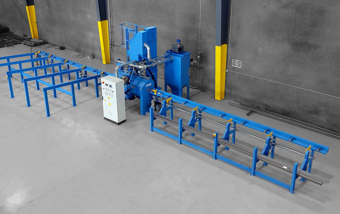 棒材拋丸機主要用于清理圓鋼、圓管、方鋼、鋼筋等型材,對工件表面進行清理和強化,除掉其上的銹層、焊渣及氧化皮,使之獲得均勻一致的金屬光澤,以提高鋼材的涂飾質量與防腐效果。公司針對用戶的生產(chǎn)狀況設計了兩款產(chǎn)品:單根清理拋丸機和多根清理拋丸機,這兩種棒材拋丸機都可以工件自動裝卸,自動化程度高,不需要人工搬運,提高生產(chǎn)效率,節(jié)約成本。為保證對清理工件的嚴格要求,我們在該拋丸機的方案和設計中采用下述關鍵技術及保證措施: