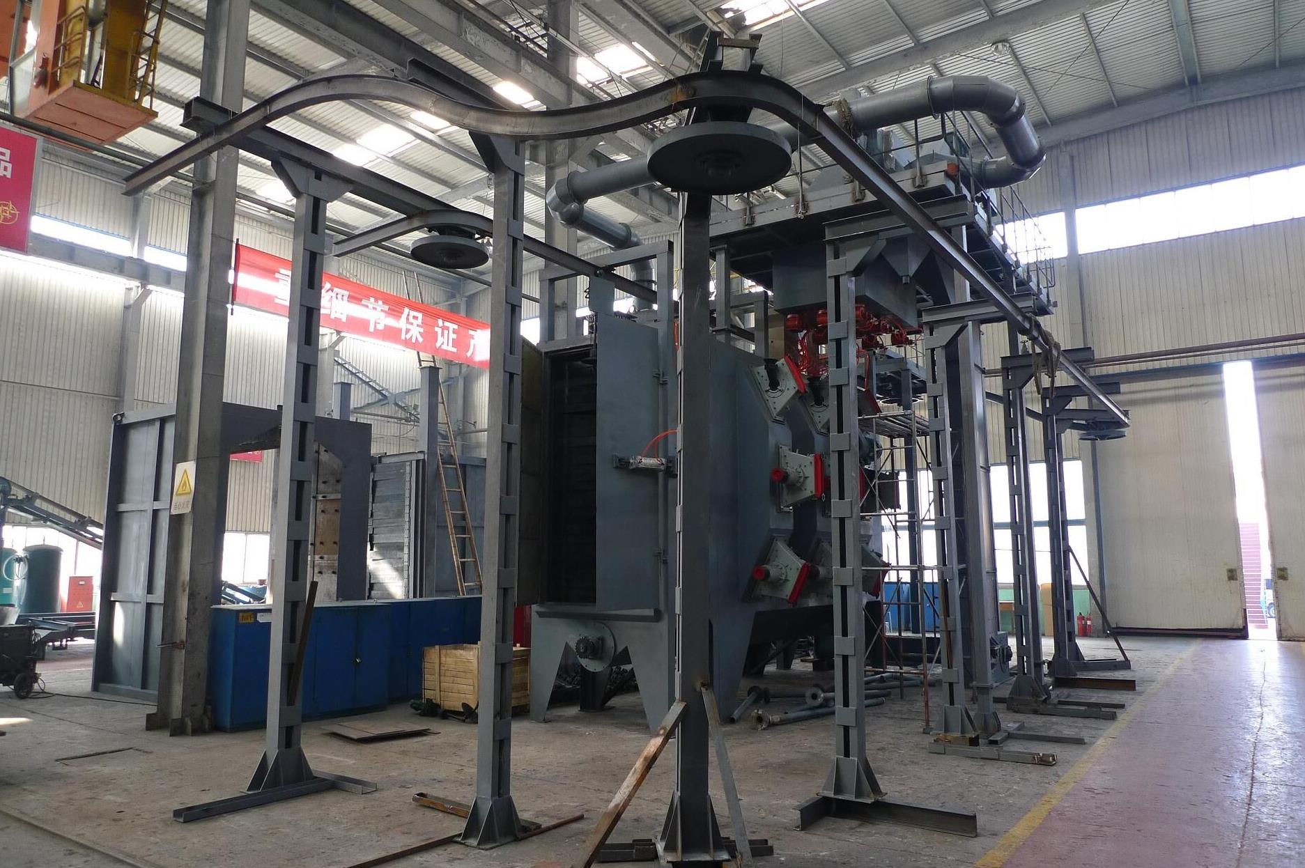 剛剛將一臺發(fā)往上海的懸鏈通過式拋丸機(jī)安裝完畢!大喜!江蘇鹽城拋丸機(jī)公司Q47懸鏈通過式拋丸機(jī)采用步進(jìn)方式對工件進(jìn)行清理,工件隨吊鏈步進(jìn)運(yùn)行,使工件在加卸料以及拋丸區(qū)分別處于停止?fàn)顟B(tài),實(shí)現(xiàn)定點(diǎn)裝卸和定點(diǎn)拋丸工序。可提高彈丸利用率和生產(chǎn)效率,適應(yīng)于批量生產(chǎn)的鑄件、鍛件、鋼結(jié)構(gòu)的表面清理,對表面及內(nèi)腔較復(fù)雜的工件,如發(fā)動(dòng)機(jī)缸體蓋、電機(jī)殼體等清理效果尤佳。該拋丸機(jī)具體工作過程如下:裝零件→步進(jìn)→關(guān)門→拋丸清理→開門→步進(jìn)→卸零件→裝零件